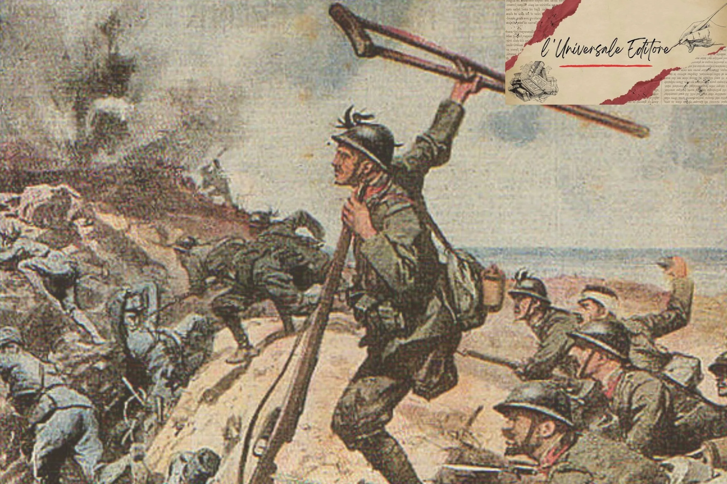 Enrico Toti throwing his crutch at the enemy as he screamed “Io Non Moro Mai”—I Will Never Die.